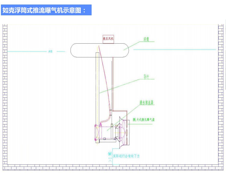 6、潜入式设备主机使曝气系统从底部到水面的循环曝气。解决了中层倾斜式推流曝气服务范围小,氧利用率低等问题,解决了底部微孔曝气堵塞,缺氧,停产清理,维护费高的多重问题。