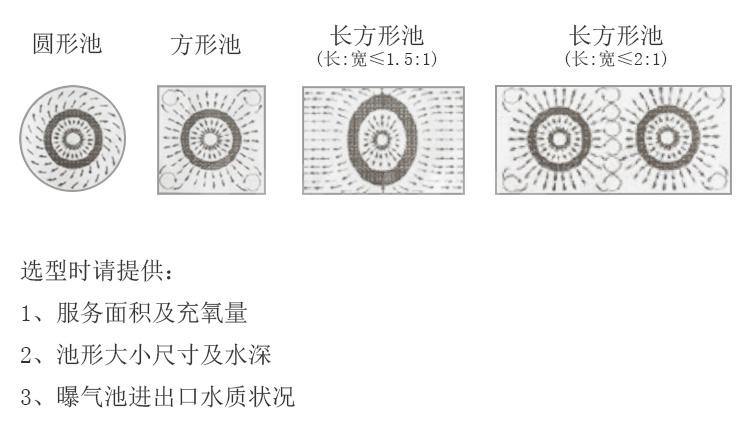 进气管上端为空气吸入口,位于水面之上,下端与混合室联通,接通电源后由于叶轮旋转,高速水流从叶轮出口流出,经混合室形成负压,因而空气被吸入并与污水混合,混合液从出口流出,完成对污水的充氧。