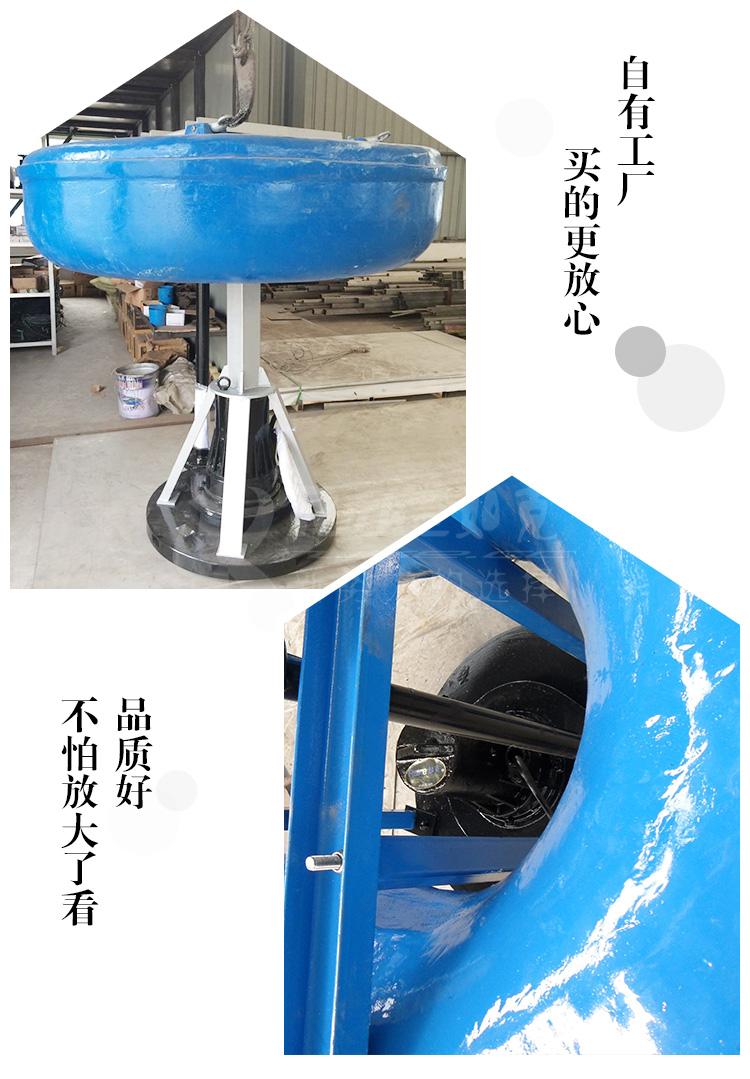 FQB在原NQXB的基础上,单边进气改为双边进气或中心进气,进气管上部加装有浮圈(不锈钢或玻璃钢制作)。浮圈、进气管、曝气机连接成一个整体。如图,浮圈依靠水的浮力使曝气机悬吊在水中,浮圈用三根钢丝绳牵拉着,钢丝绳的另一端固定在池边,或在池塘里设三个锚点固定。安装时将曝气机和浮圈整体放入水中,并用钢丝绳拖至预定区域,再将三根钢丝绳另一端分别按三个不同方位固定在池边,水面较大的池塘可设三个锚点定位。检修时只需将固定在池边的钢丝绳解开,把设备拉回池边吊出水面即可。