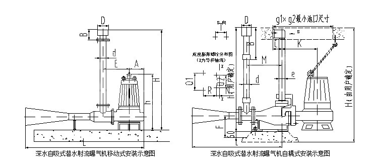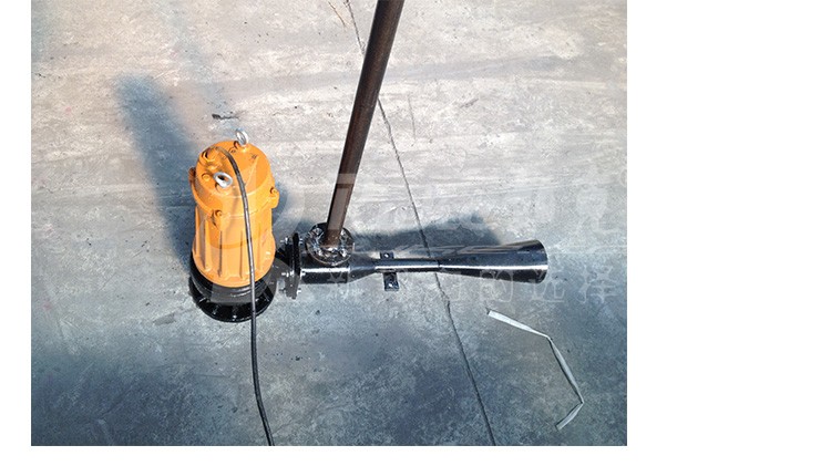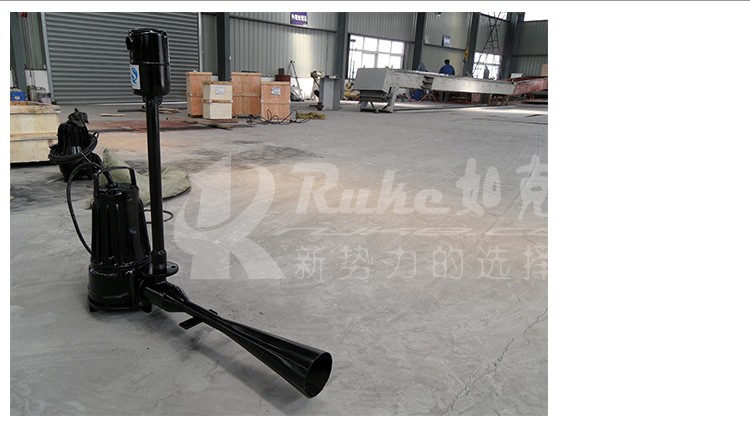 该曝气机由潜水电泵与喷射泵组成,从而使水体搅动与充氧同时进行,既可获得较高的氧气吸收率,又具有叶轮无堵塞优点。