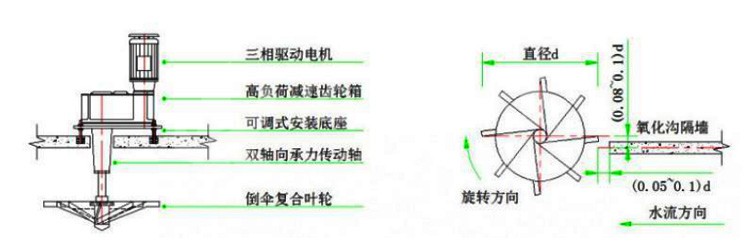 PELY 立式倒伞表曝机由电动机、插入补偿式联轴器、平行立轴式减速箱、双轴向承力传动装置、叶轮升降装置、泵吸式倒伞叶轮等组成。旋转叶轮将底部污水及污泥沿叶轮倒锥螺旋状提升,上升的污水挟带周边水体从叶轮边缘甩出,形成水跃并裹进大量空气实现充氧曝气。并将池底层含氧少的混合液向上提升环流、更新,同时在叶轮旋转的推动和提升作用下,推动水流在氧化沟内以>0.3m/s 的水速呈螺旋形的状态向前环流,使沟内活性污泥混合液保持悬浮状态,达到充氧的目的。倒伞复合叶轮表面曝气机为垂直轴低速表面