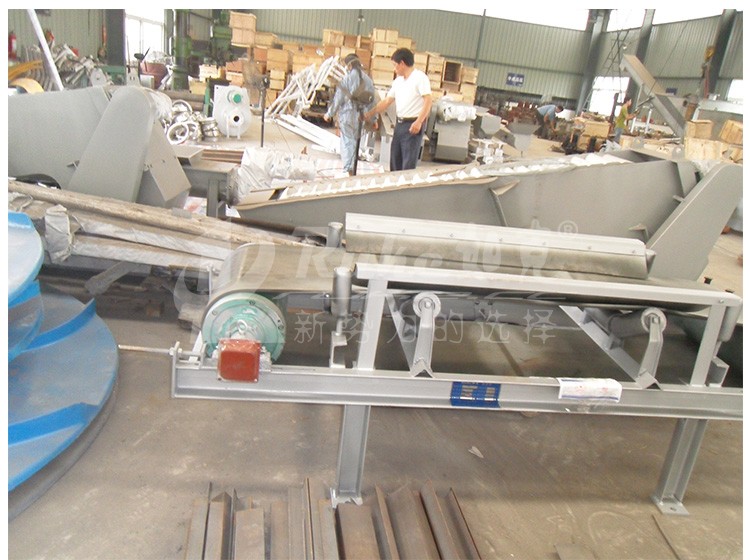 该设备采用连续式槽形带式,物料由格栅或脱水机卸料口落入输送带上,在电动滚筒的驱动下,物料从一端移动到另一端,末端与垃圾桶相衔接,再另行处理。