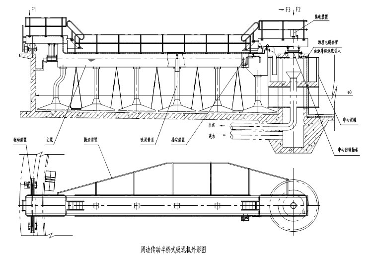 ZBXN 型系列吸泥机如图 1 所示为周边传动虹吸式,由兼作输泥槽的主梁、吸泥管系、虹吸抽空系统、中心泥罐、中心回转轴承、驱动装置、撇渣装置、集电器、控制柜等构成。主梁由置于周边的驱动装置带动,绕池中心轴线旋转,沉积在池底的污泥由刮泥板刮集至各吸泥口,在液位差的作用下,污泥经吸泥口,输泥槽、虹吸管、中心泥罐、中心排泥管排至污泥坑。每个吸泥管上端设有调节器,以调节各吸泥管的流量分配。同时,液面上的浮渣向随主梁旋转的撇渣板和周边浮渣挡板形成的渐缩区域内集中,直至其封闭边—刮渣摆臂。当摆臂抵达集渣斗时,由摆臂上的刮渣板刮至集泥斗。