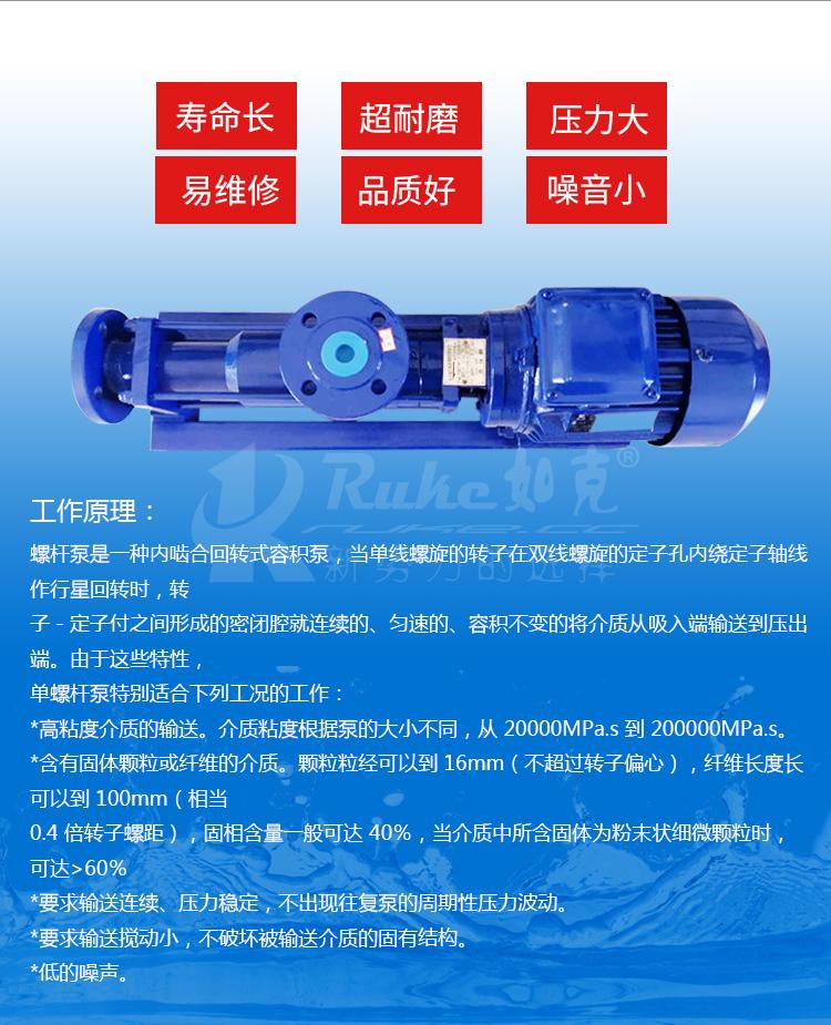 G系列螺杆泵是一种内啮合的密封式螺杆泵,属转子式容积泵。单螺杆泵输送介质时扰动小、泵压稳、吸入性能好,可以输送粘稠的非牛顿液体及含有机械杂质和固体颗粒的浓缩物,泵量调节性能好,效率高且高 效区宽。适用于输送介质温度-10℃~80℃(泵可达 150℃)、粘度 20000~200000MPa.s 的所有工业部门。可广泛用于原油、污油、矿浆、泥浆、化工和化纤浆液、胶水、涂料、糖浆、果酱、化妆品以及浓缩污水等介质的输送。