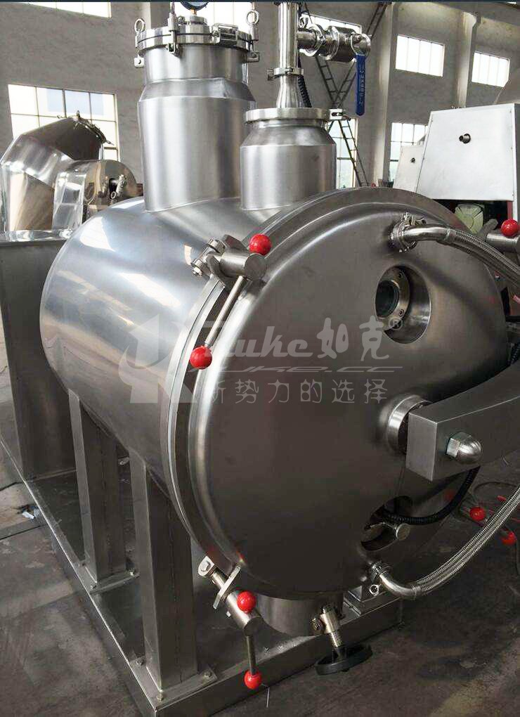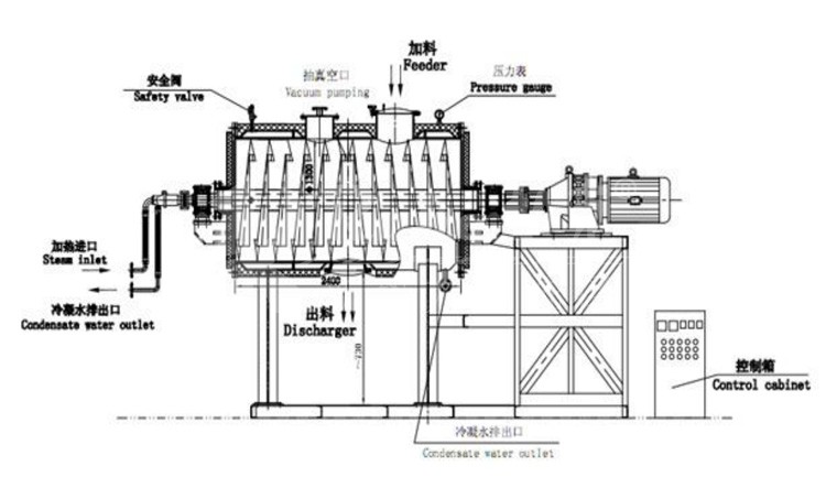 1、 装载物料的筒体设置加热夹套,夹套外部设置保温层,防止热量向环境扩散,减少热损失;筒体下部设有卸料口,上部设有两个加料口和一个排气口,加料时,应从两个加料口同时等量加入;加料量为容积的 60%~80%,不得超过容积的 80%,否则将影响蒸发气体的顺利排出,当所加载物料的粘性特强时,加料量应适当减少,以防止传动电机过载、损坏设备。